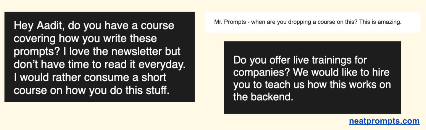 I run neatprompts.com (approx 100k visits per month)I share useful ChatGPT prompts and AI tools to boost your productivity in my newsletter.I was told that I should create a course on how I create these prompts, my prompt writing framework and some useful use cases. And contrary to the norm, I actually listen to what others said this time.